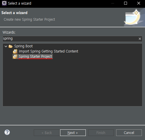 4. Select a wizard 창이 나오면 "spring"를 검색 후 Spring Starter Project를 선택하고 Next > 를 클릭해줍니다.